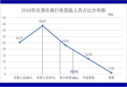 例如,以13家樣本機構之外的浙江樂清農商銀行2018年末名各層級人員占比為例。在該銀行820名員工之中,后勤和其他人員占比25.27%,柜面人員占比38.67%,合計數值63.94%,與同期35周歲以下員工的占比71.43%數值相近(基層員工多數是青年員工)。這兩個層級的員工絕大部分是拿不到本銀行平均薪酬的(2018年約56萬元,高于同期12家樣本機構中最高一家的平均薪酬,也高于同期同在一個地區的溫州銀行37.8萬元的平均薪酬)。