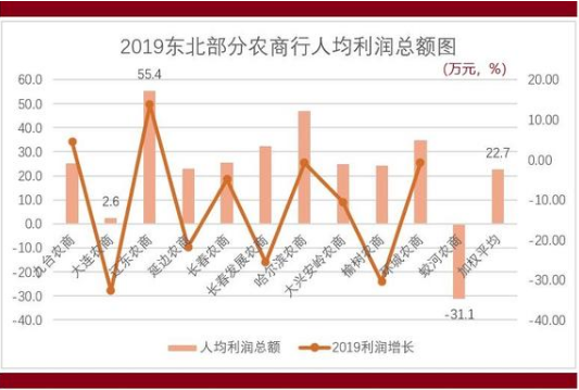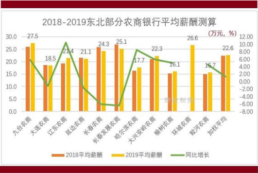通過上述員工數(shù)量、薪酬總額的分析,我們可以測算出東北17家樣本農(nóng)商銀行2018年和2019年的加權(quán)平均薪酬分別為22.3萬元和22.6萬元;2019年度同比微漲1.35%,直接原因是薪酬總額有少量增長而年度平均員工數(shù)量略有減少。