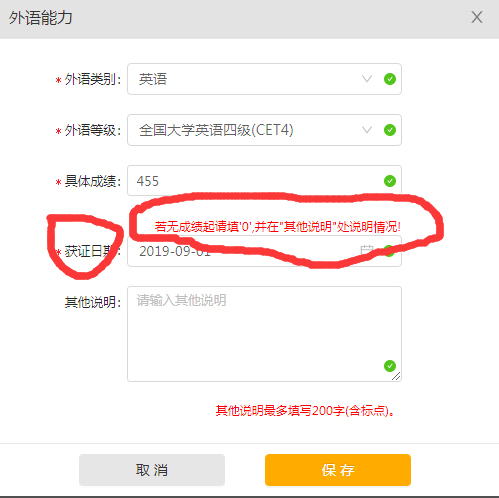 獲證日期的話記不得具體的就有查分成績那天即可,其他說明可以不寫如果不是“0”的情況。