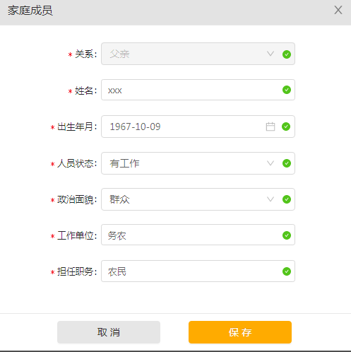 家庭成員這里可能產生問題的主要是“人員狀態”,如果選擇無工作等,工作單位和職位自動就無需填了。