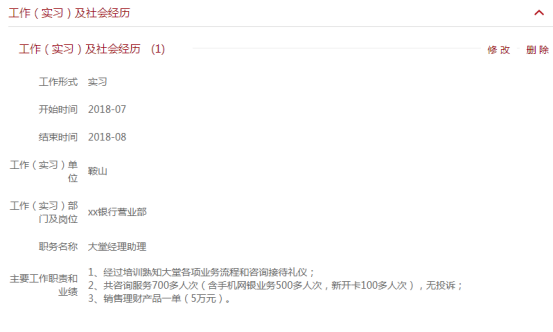 同時也是因為很多學生沒有正規的實習只有一些零散的兼職活動,這里的話就盡量寫和同學所報銀行崗位相關的一些兼職經歷,描述過程中注意用詞盡量用數據和技能說話。