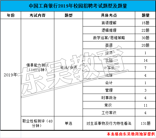 1.工商銀行校園招聘考試內(nèi)容暫未公布,根據(jù)往年情況,中國工商銀行 <http://www.8b1u.cn/gsyh/>校園招聘筆試內(nèi)容科目分為情景能力測試和職業(yè)性格測評;本質(zhì)考察的還是:通用素質(zhì)能力測試(EPI)、綜合知識、英語這三個部分。