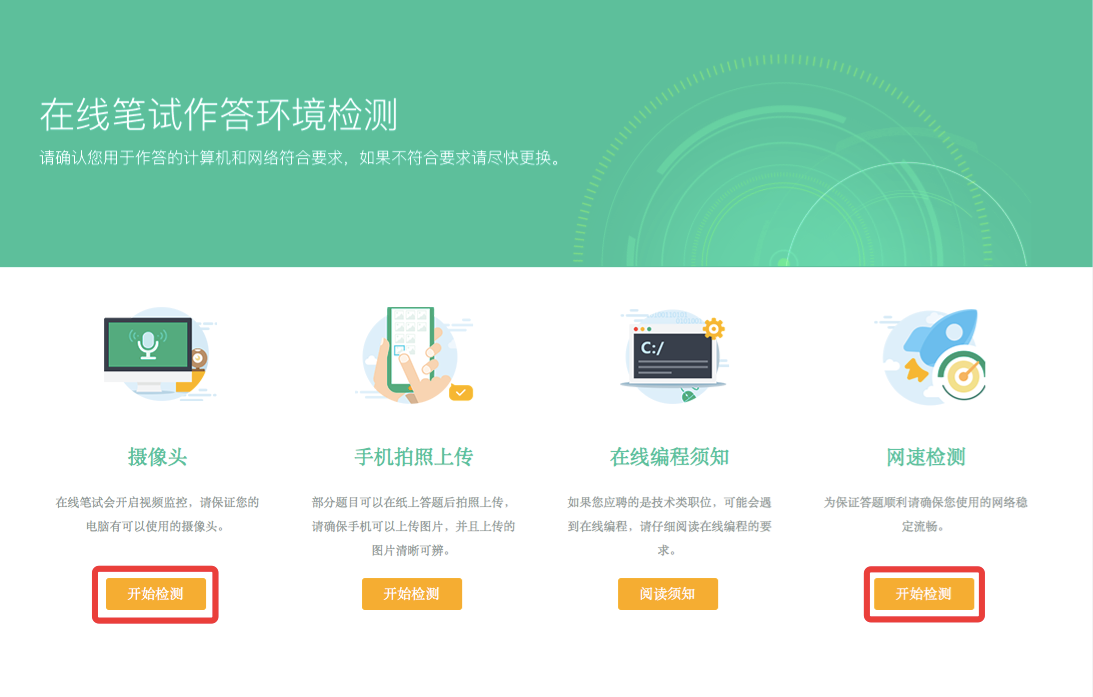2.軟件準備:請確保作答前關閉易出現彈窗、廣告的軟件或網頁,如QQ、微信、360、迅雷等(彈窗會導致考試界面跳出,頻繁跳出將被視為作弊);請確保您的電腦安裝了Chrome瀏覽器(52以上版本,下載網址https://www.baidu.com/s?wd=chrome)并確保攝像頭可用。為了考試順利,請盡早前往https://assistant.ceping.com進行攝像頭、網速等作答環境的檢測(如下圖):