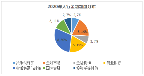 (二)金融部分考查內(nèi)容廣泛,主要包括貨幣銀行學(貨幣、信用、利率、貨幣供需、貨幣政策等)、金融市場學(貨幣市場、資本市場、衍生品市場等)、金融機構(gòu)(中央銀行、商業(yè)銀行)、國際金融(國際收支、外匯與匯率)、投資學等。2020年人行考試題量分布如下圖。