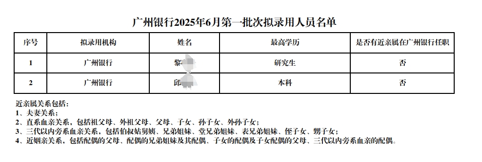 2025年廣州銀行6月第一批次擬錄用人員公示