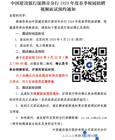2020建設銀行深圳分行春季校園招聘視頻面試預約通知