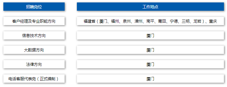 具體崗位及職位表請參考招聘公告,詳見《2020年廈門銀行春季校園招聘啟動公告》。