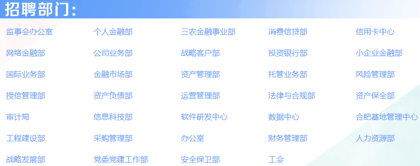 總行各部門、各直屬單位專業崗位。具體招聘崗位及招聘條件詳見職位發布頁面。
