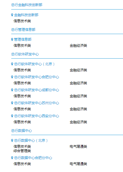 中國郵政儲蓄銀行總行信息科技管理部、金融科技創新部、管理信息部、軟件研發中心、數據中心。