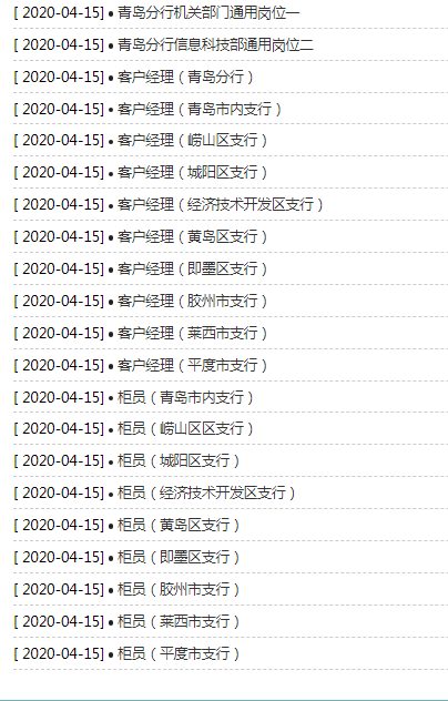 本次招聘涉及青島分行及下轄各區(qū)市支行通用崗位(包含專業(yè)類、銷售類崗位)、柜員崗位等。具體招聘崗位詳見職位發(fā)布頁面。