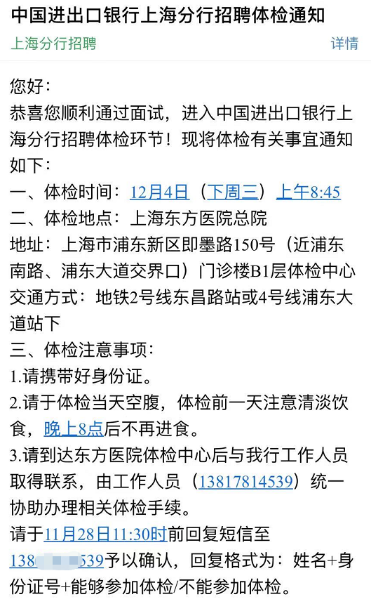 [上海]2020年中國進出口銀行上海分行校園招聘體檢通知