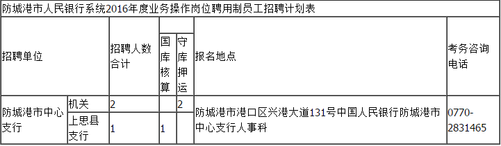 招聘單位、招聘數量、招聘崗位、報名地點和具體聯系方式詳見《防城港市人民銀行系統2016年度業務操作崗位聘用制員工招聘計劃表》