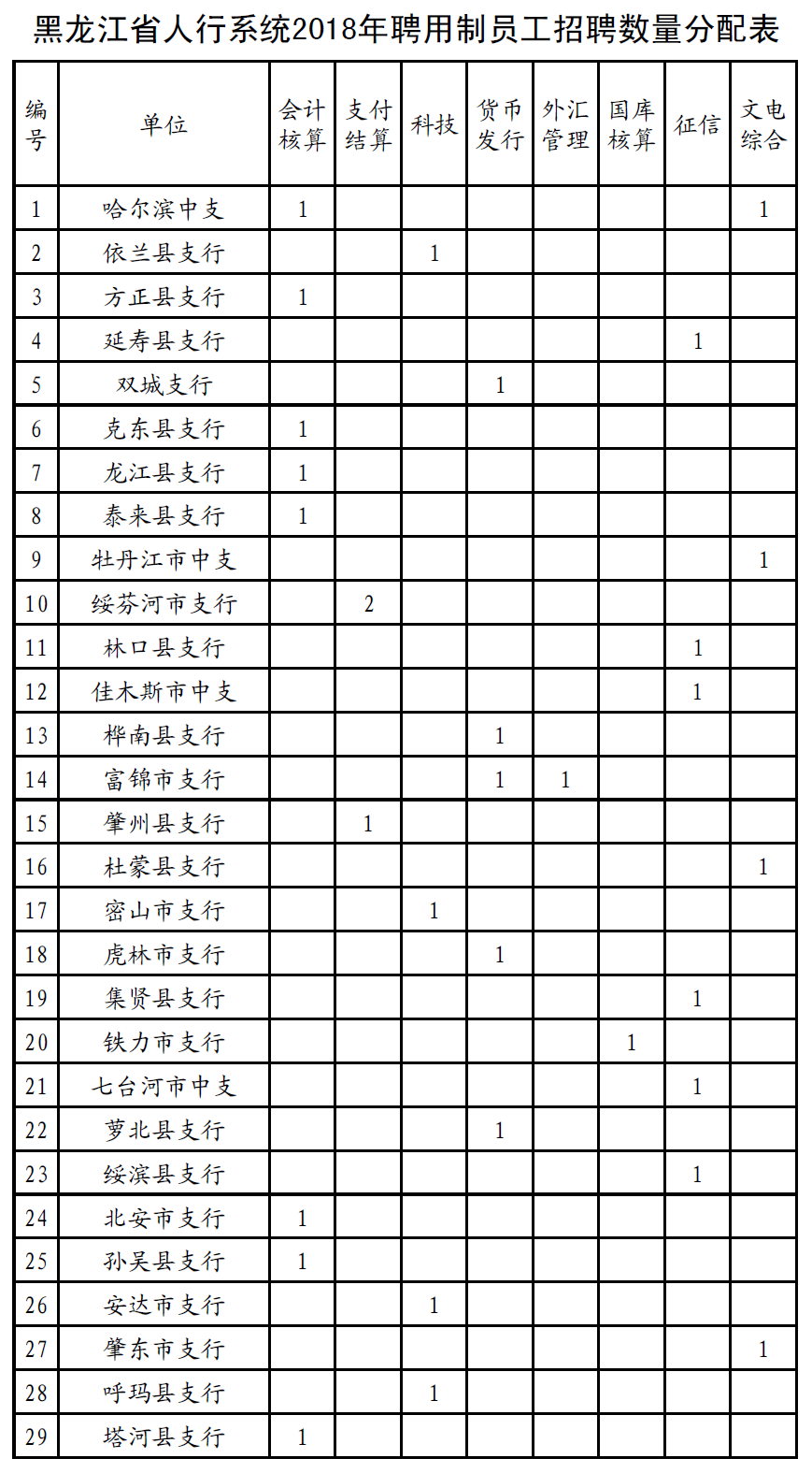 黑龍江省人民銀行分支機構2018年業務操作崗聘用制員工招聘工作。現將有關事項公告如下: