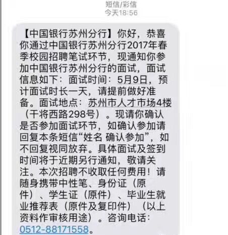 [江蘇]2017年中國銀行蘇州分行春季校園招聘面試通知