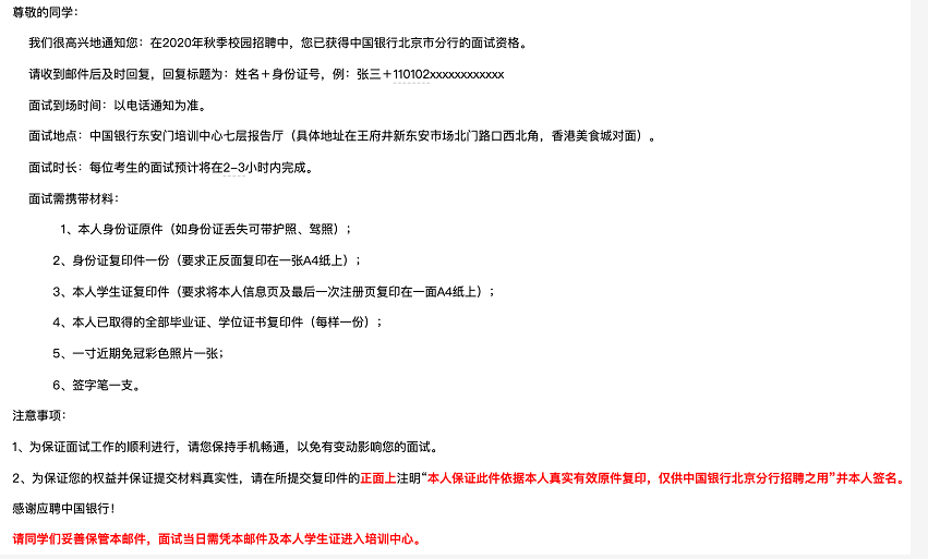 [北京]2020中國銀行北京分行校園招聘面試通知