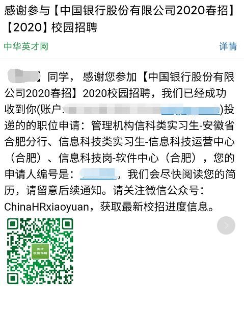 2020年中國銀行安徽省分行春招投遞職位申請反饋通知