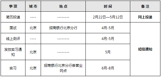 應聘者請關(guān)注“招商銀行招聘”微信公眾號,選擇“我要應聘-實習生計劃—北京分行” 選擇相應職位投遞電子簡歷。
