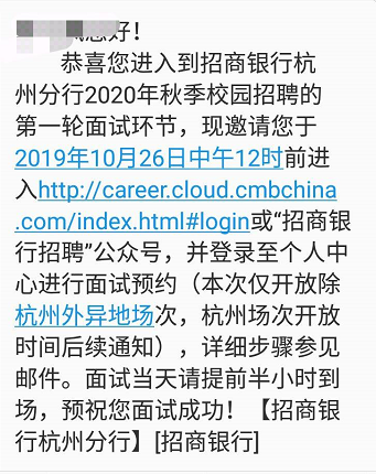 [浙江]2020招商銀行杭州分行校園招聘面試通知